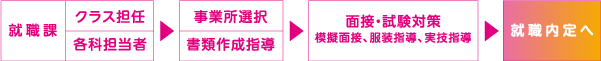 就職課は、学生と希望する事業所とを結びつけるお手伝いをしています。クラス担任などとも連携し、進路決定率100%の実績を上げています。